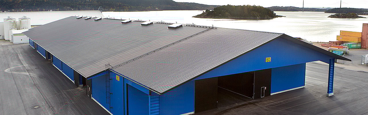 Det nyeste tilskuddet til de 40 000 kvadratmeterne med lagerflate som allerede finnes i havnen, er en hall levert av Borga. Det er en imponerende bygning på 6000 kvadratmeter helt fri flate. Den vakre blåfargen gjør at bygningen stikker seg ut, og ifølge bestilleren oppfyller den sin funksjon på beste vis.