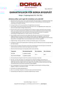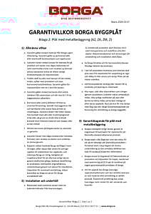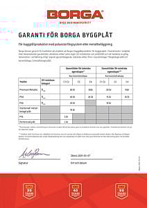 Garantivilkår for tak-/veggplater med fargesystem polyester: P30, Matt, P50 og Premium Metallic. Borga gir garanti for kvaliteten på fargesystemet som brukes på byggplater for byggeprosjekt i Skandinavia i henhold til Allmenne vilkår og Garantiforpliktelser ved presentasjon av gyldig reklamasjon.